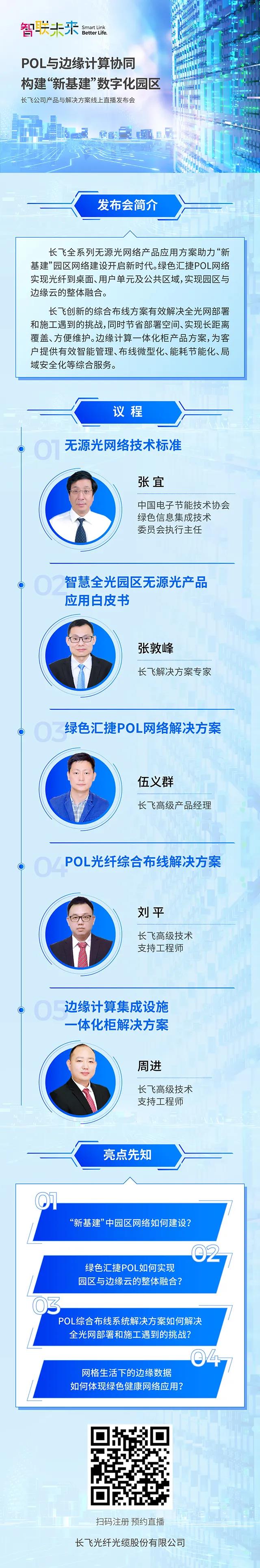 ICC訊 6月28日,長(zhǎng)飛光纖光纜股份有限公司(以下簡(jiǎn)稱“長(zhǎng)飛公司”,股票代碼:601869.SH、06869.HK)推出“智聯(lián)未來(lái)”產(chǎn)品與解決方案線上直播系列發(fā)布會(huì)首場(chǎng),反響熱烈。7月10日,長(zhǎng)飛公司將推出第二場(chǎng)線上直播發(fā)布會(huì)——“POL與邊緣計(jì)算協(xié)同,構(gòu)建‘新基建’數(shù)字化園區(qū)”,聚焦智慧全光園區(qū)無(wú)源光產(chǎn)品應(yīng)用、綠色匯捷POL網(wǎng)絡(luò)解決方案、POL網(wǎng)絡(luò)和光纖綜合布線、邊緣計(jì)算集成設(shè)施一體柜等解決方案,展現(xiàn)長(zhǎng)飛公司在“新基建”大潮中助力開(kāi)啟園區(qū)萬(wàn)物互聯(lián)的綜合服務(wù)能力。