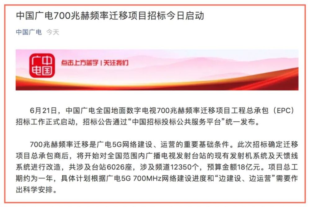ICC訊 6月21日,中國廣電發(fā)布,中國廣電全國地面數(shù)字電視700兆赫頻率遷移項(xiàng)目工程總承包(EPC)招標(biāo)工作正式啟動(dòng)。