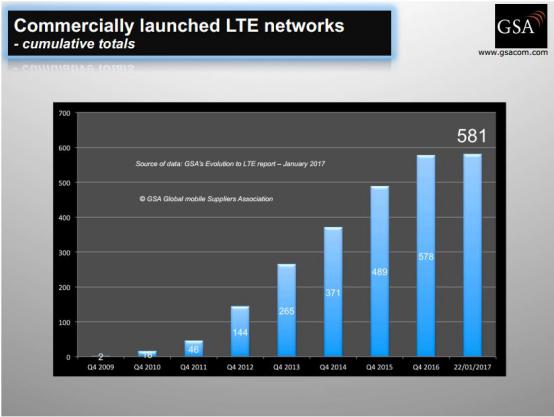 ICCSZ訊 過去一年中,LTE在全球高速擴張。來自GSA的最新報告顯示,截至2017年1月末,全球運營商已經(jīng)簽署764張LTE網(wǎng)絡(luò)合同,覆蓋196個國家,其中,已經(jīng)商用部署的網(wǎng)絡(luò)達到581張。在LTE生態(tài)方面,全球目前共發(fā)布了7037款LTE終端,分別來自517個供應(yīng)商。其中,智能手機達到4559款。2017年,LTE將延續(xù)這一發(fā)展勢頭,GSA預(yù)測,截至2017年底將商用部署635張LTE網(wǎng)絡(luò)。