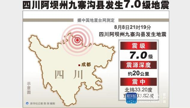據(jù)中國地震臺網(wǎng)正式測定:8月8日21時19分在四川阿壩州九寨溝縣(北緯33.20度,東經(jīng)103.82度)發(fā)生7.0級地震,震源深度20千米。