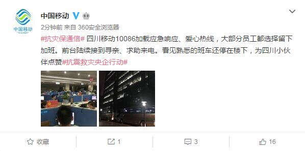 災(zāi)情發(fā)生后,三大運營商第一時間啟動應(yīng)急搶險保通信工作。中國移動發(fā)布微博稱,地震發(fā)生后,中國移動立即對受災(zāi)地區(qū)通信設(shè)施進行核查,了解災(zāi)情對移動通信網(wǎng)絡(luò)帶來的影響,對阿壩地區(qū)和附近地市開啟免停機服務(wù)。并開通10086熱線愛心救助及尋親緊急服務(wù),優(yōu)先保障阿壩地區(qū)熱線接入。