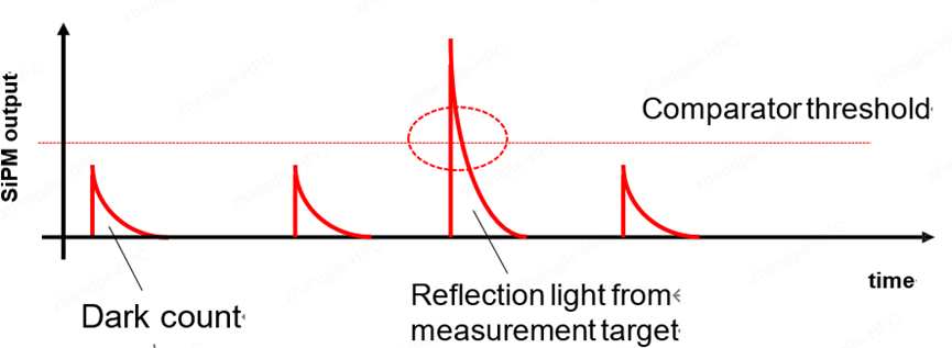 2、SPADs和SiPM兩種方案獲得有效信號(hào)方式的關(guān)鍵區(qū)別在于,是依靠時(shí)間相關(guān)矯正電路去區(qū)分信號(hào)和噪聲,還是依靠可配置多路比較器的閾值篩選信號(hào)和噪聲;