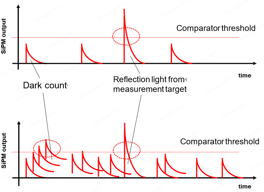但是當(dāng)噪聲隨著溫度提高而倍增,超過(guò)了一定的閾值,暗計(jì)數(shù)會(huì)被記錄為光信號(hào),比如1.5 pe高度,進(jìn)而導(dǎo)致錯(cuò)誤探測(cè)。舉個(gè)例子,從15°到105°,暗計(jì)數(shù)會(huì)增加1000倍,(每30度提高,暗計(jì)數(shù)提高10倍)。因此,如果在15°C時(shí)暗計(jì)數(shù)為100 kHz,那么在105°C時(shí)暗計(jì)數(shù)就會(huì)變成100 MHz。在正常溫度范圍內(nèi)沒(méi)有問(wèn)題,但在高溫范圍內(nèi)誤報(bào)的概率會(huì)增加??紤]到最高使用溫度為105°C,在正常溫度下暗計(jì)數(shù)約為100 kHz是理想的。如果暗計(jì)數(shù)超過(guò)這個(gè)值,在高溫范圍內(nèi)誤報(bào)的概率就會(huì)增加,從而降低準(zhǔn)確性。如下圖中下方高溫情況示意圖。
