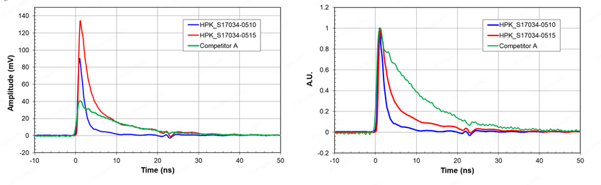 第二個(gè)是FWHM,首先要說(shuō)明是Signal FWHM和后面的Amplifier的時(shí)間特性有強(qiáng)相關(guān)性,越快的信號(hào)FWHM越能方便系統(tǒng)獲得真實(shí)的信號(hào)而降低錯(cuò)誤率。有時(shí)候由于放大器的參數(shù)太low,導(dǎo)致細(xì)微的差異在過(guò)程中被忽略掉。我們針對(duì)目前市面上外購(gòu)的主流15um的SiPM進(jìn)行的同等情況下的對(duì)比,得到如下的結(jié)果:看圖說(shuō)話清晰明了。無(wú)論是加多閾值比較器還是快速的TDC采樣,更好的FWHM意味著更高的準(zhǔn)確率。