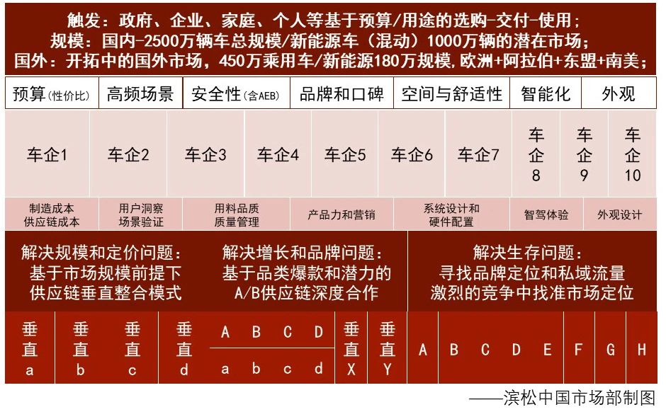俗語(yǔ)云:“不謀全局者,不足謀一域?!? 未來(lái)2年是中國(guó)汽車(chē)工業(yè)的競(jìng)爭(zhēng)白熱化的階段,每個(gè)層級(jí)的要素都影響著競(jìng)爭(zhēng)格局。不做定位者,難以出精品,如何在大浪淘沙的環(huán)境下,獲得本公司企業(yè)的發(fā)展優(yōu)勢(shì)和價(jià)值錨點(diǎn),是我們一直要思考的問(wèn)題,和既得規(guī)模者比規(guī)模,和既得AI+視覺(jué)者比數(shù)據(jù)和算力,和品牌信仰的比品牌等都需要巨大的投入。那么什么是中國(guó)新能源汽車(chē)市場(chǎng)的大格局,大格局下我們每一個(gè)層級(jí)的企業(yè)怎么看自己的護(hù)城河,我放一張圖在下面,供大家思考和共勉,圖例不做過(guò)多解釋,老規(guī)矩看圖說(shuō)話,自己腦補(bǔ)。