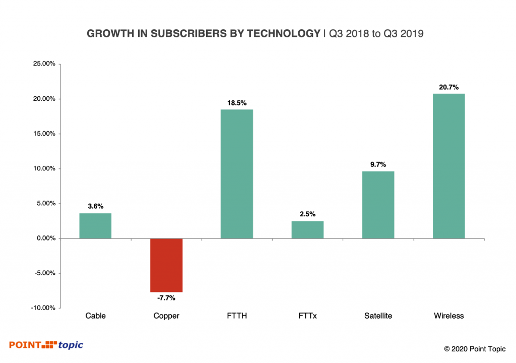 無線(主要是FWA)和衛(wèi)星持續(xù)增長,在2018年第三季度和2019年第三季度之間分別增長了20.7%和9.7%。