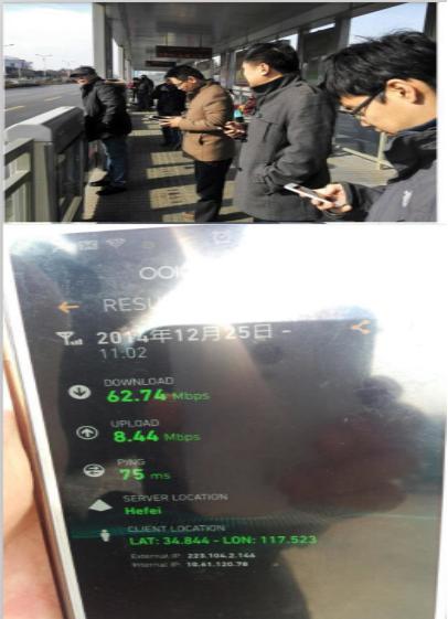 中午,記者在位于棗莊市區(qū)客流量最大的BRT換乘樞紐進(jìn)行4G業(yè)務(wù)體驗(yàn)。時(shí)值中午下班高峰,大量乘客同時(shí)移動(dòng)上網(wǎng),在此情況下實(shí)測(cè)網(wǎng)絡(luò)下行速度超過(guò)62M,體現(xiàn)出了4G超高的帶寬承載量!