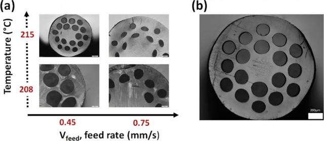 擠出后,光纖被拉過相鄰的一組輥子。這樣,在冷卻和設置時,光纖就會被拉緊,這樣,光纖內(nèi)部的任何通道就不會自行塌陷。據(jù)稱,整個過程不僅比傳統(tǒng)技術更快、成本更低、結構更緊湊,而且纖維的長度只受限于可送入擠出機的顆粒數(shù)量。