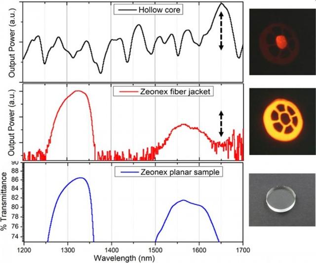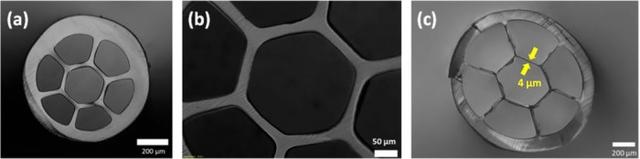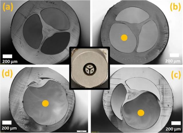 而 Cordeiro 教授開發(fā)了一種替代系統(tǒng),能夠在和微波爐差不多的設備上對原料進行拉絲。在Cordeiro的設置中,透明的熱塑性聚合物顆粒被送入該設備,隨后該設備將其熔化,并通過一個定制的鈦噴嘴將熔融的材料擠出。根據(jù)該噴嘴的配置方式,被擠出的細光纖可以是實心的,也可以有多條空氣通道縱向穿過其內(nèi)部--后者被稱為微結構光纖,或MOF。