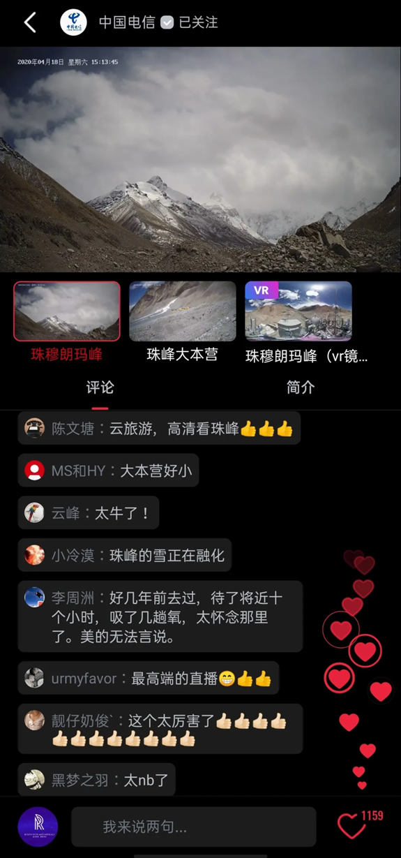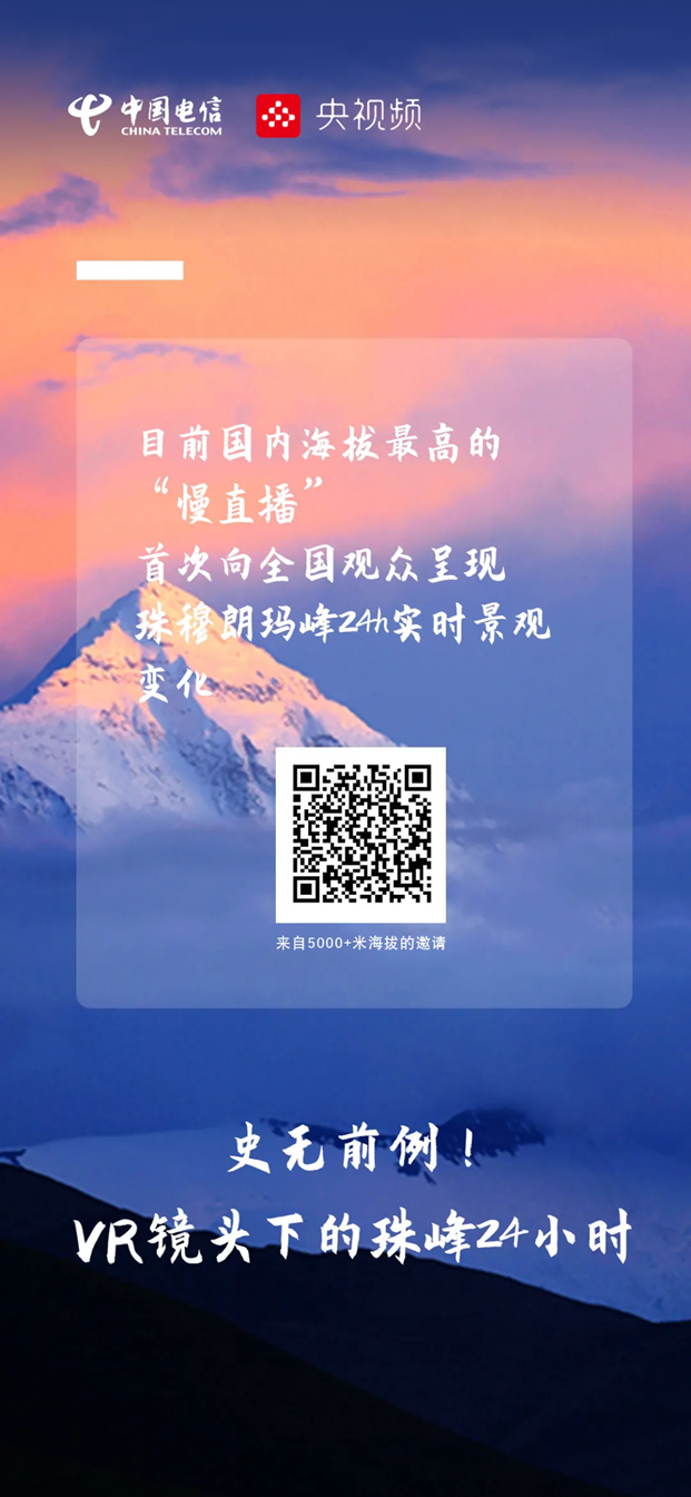 4月14日,中國電信聯(lián)合央視頻推出5G慢直播,通過4K高清畫面,以VR視角帶廣大網(wǎng)友看珠穆朗瑪峰日升日落的24小時,標志著“云登頂”項目正式上線。通過5G和云網(wǎng)相結(jié)合,廣大網(wǎng)友將足不出戶,欣賞到珠穆朗瑪峰的壯美與險峻,目力所及,世界之巔。同時,通過轉(zhuǎn)動手機,還可以自主調(diào)節(jié)觀看角度,實現(xiàn)360°看珠峰全貌體驗身臨海拔5000米看珠峰的沉浸式感受。