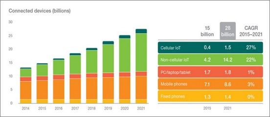 2015至2021年,物聯(lián)網(wǎng)預(yù)計(jì)將以23%的復(fù)合年增長率增長,其中蜂窩物聯(lián)網(wǎng)的增長速度最快。到2021年,互連終端總數(shù)預(yù)計(jì)達(dá)到280億臺(tái),其中包括近160億臺(tái)物聯(lián)網(wǎng)終端。