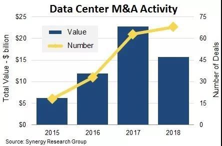 2018年,最大的交易是Global Switch將其25%的股份出售給亞洲財(cái)團(tuán),其價(jià)值為28億美元。另外有四項(xiàng)價(jià)值10億美元以上的交易涉及Digital Realty,Iron Mountain,GTT和Brookfield Infrastructure Partners的收購。此外,有18宗交易價(jià)值在1億至10億美元之間,45宗較小的交易價(jià)值也都達(dá)到1億美元。Synergy Research Group表示,2017-2018年期間的并購交易的總價(jià)值是前兩年總和的兩倍多。