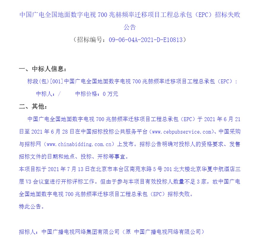 ICC訊 7月2日,負(fù)責(zé)“中國廣電全國地面數(shù)字電視700兆赫頻率遷移項目工程總承包(EPC)”的招標(biāo)代理機構(gòu)公誠管理咨詢有限公司發(fā)布招標(biāo)中標(biāo)結(jié)果公告,確認(rèn)該項目招標(biāo)失敗。