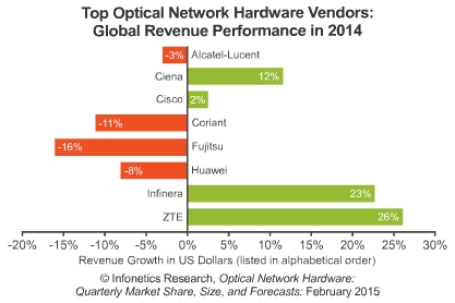 * Infinera,北美和EMEA市場增長最快的廠商,在2014年大獲成功,其收入年增23%,Ciena增幅為12%。