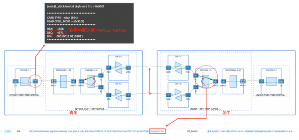 引入了DCO模塊收斂計(jì)時(shí)功能,如上圖所示,TOOP系統(tǒng)可以記錄光路倒換過程的持續(xù)時(shí)間,包括光保護(hù)(OP)板卡的光開關(guān)切換時(shí)間與DCO模塊的業(yè)務(wù)中斷時(shí)間。我們定義了DCO模塊的業(yè)務(wù)中斷計(jì)時(shí)功能,定義0x910e(高位)與0x910f(低位)寄存器內(nèi)儲(chǔ)存了DSP收斂時(shí)間,其十進(jìn)制值即收斂時(shí)間,單位us,上圖中的測試結(jié)果為4971us=4.971ms,這樣的數(shù)據(jù)協(xié)助我們診斷系統(tǒng)的性能問題。例如,當(dāng)某次保護(hù)切換事件發(fā)生時(shí),OP開關(guān)切換時(shí)間較短,而DSP的收斂時(shí)間較久,則說明線路性能余量不足,在光信號(hào)劣化至光開關(guān)切換門限值之前DSP已經(jīng)產(chǎn)生了誤碼。