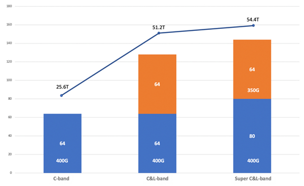 2.按照當(dāng)下7nm 芯片400G場景來計(jì)算,Super C&L-band比C&L-band容量增加有限(51.2Tbps vs 54.4Tbps),但是成本要高30% -40%,因而我們認(rèn)為C+L是目前性價(jià)比更好的方案。