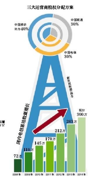 據(jù)了解,目前暫定的鐵塔公司中,三家公司股權(quán)分配方案是:中國移動將占有最大份額,約為40%,中國聯(lián)通和中國電信兩家各占30%。不過也有媒體采訪三大運營商,稱目前尚沒有達成任何最終協(xié)議。