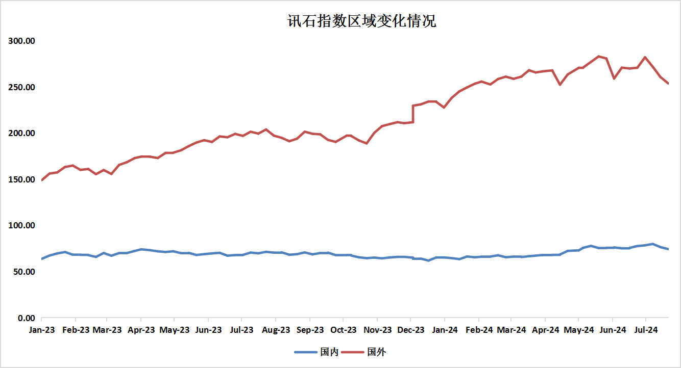按地區(qū)劃分,截止到7月26日,ICC所統(tǒng)計(jì)的國(guó)內(nèi)通信指數(shù)為74.37,環(huán)比下滑4.17%。國(guó)外通信指數(shù)為257.33,較上月下滑4.98%。整體來(lái)看,國(guó)內(nèi)通信股指和國(guó)外通信股指均出現(xiàn)下滑。