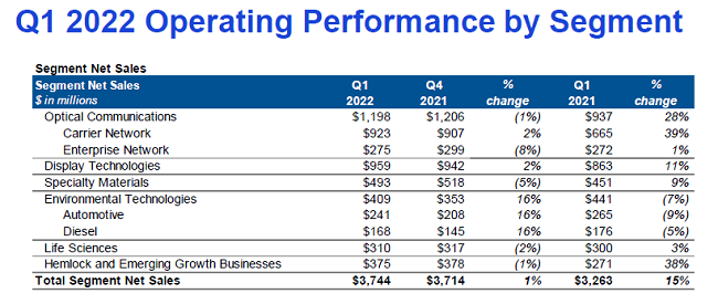 康寧董事長兼首席執(zhí)行官Wendell P. Weeks表示:“得益于我們所有業(yè)務(wù)的強(qiáng)勁表現(xiàn),尤其光通信業(yè)務(wù)銷售收入同比增長28%以及顯示業(yè)務(wù)的持續(xù)較好定價,我們在2022年迎來了一個出色的開端。第一季度,公司銷售收入同比增長15%,每股收益增長最快,達(dá)到20%。我們成功應(yīng)對了復(fù)雜的地緣政治和外部運(yùn)營環(huán)境,我們的創(chuàng)新和調(diào)價行動也幫助提高了盈利能力。展望未來,客戶對康寧的需求從未像現(xiàn)在這樣強(qiáng)勁。隨著我們推進(jìn)創(chuàng)新并繼續(xù)專注于定價、資本效率和產(chǎn)生現(xiàn)金,我們預(yù)計今年的收入和利潤將實現(xiàn)強(qiáng)勁增長。”