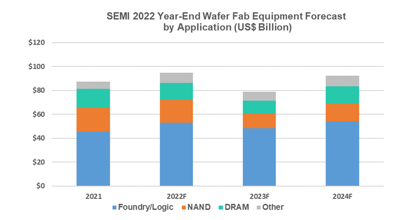 代工和邏輯部分的設(shè)備銷售占晶圓廠設(shè)備總收入的一半以上,預(yù)計2022年將同比增長16%,達(dá)到530億美元,這是由于對前沿和成熟節(jié)點的需求仍然強(qiáng)勁。預(yù)計2023年投資將減少,導(dǎo)致整個分類的銷售額預(yù)計下降9%。