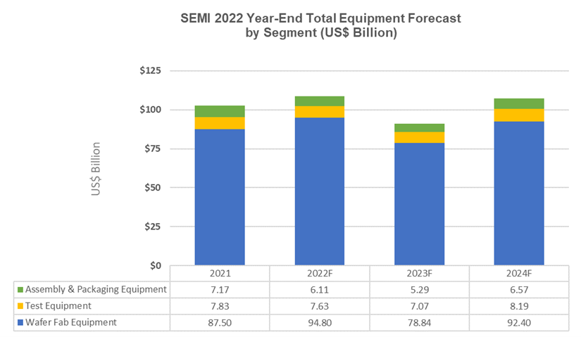 不過,SEMI認(rèn)為全球半導(dǎo)體制造設(shè)備市場預(yù)計明年將收縮至912億美元,然后在前端和后端部分的推動下于2024年回升。
