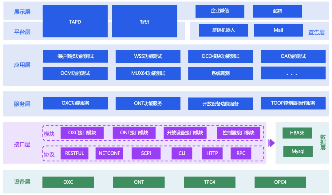 光網(wǎng)絡(luò)系統(tǒng)測試自動化平臺能力已經(jīng)構(gòu)建完成,如圖2-5,設(shè)備層通過OXC實現(xiàn)動態(tài)拓?fù)湔{(diào)整,接口層打通各類儀表、設(shè)備,頂層接入公司級公共服務(wù)平臺,應(yīng)用層依據(jù)測試用例逐步實現(xiàn)中。