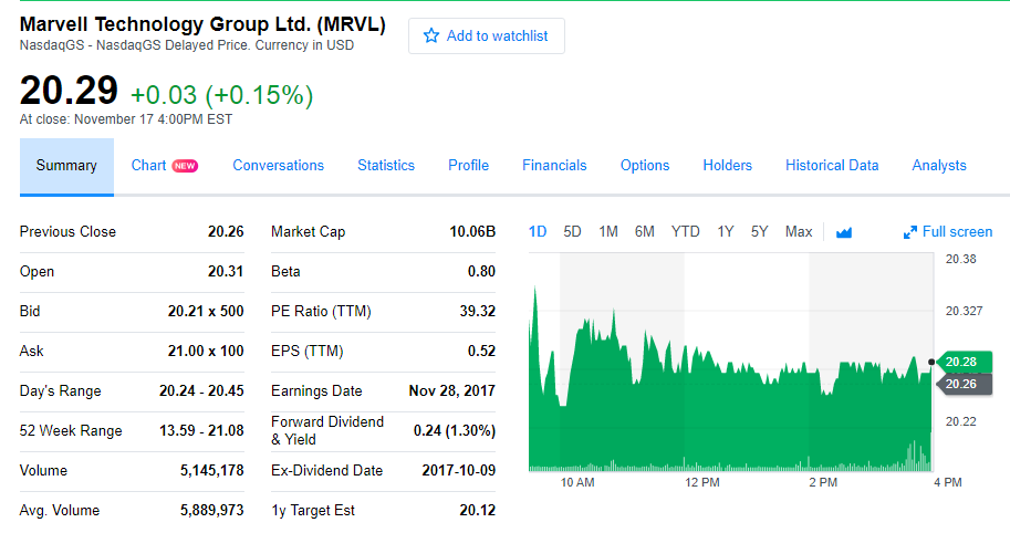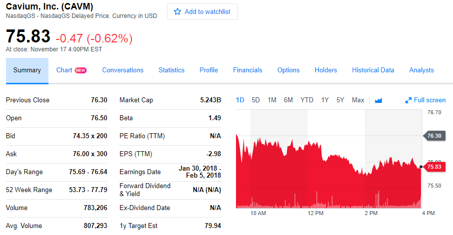 上周五,Marvell股價上揚0.15%,報收20.29美元;Cavium報75.83美元,收跌0.62%。