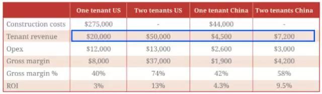 在美國,鐵塔只有一個(gè)租戶時(shí),租金收入為20000美元,新增一個(gè)租戶時(shí),鐵塔公司的租金收入上升到了50000美元,也就是說,甭管你租戶多少,拒不打折。