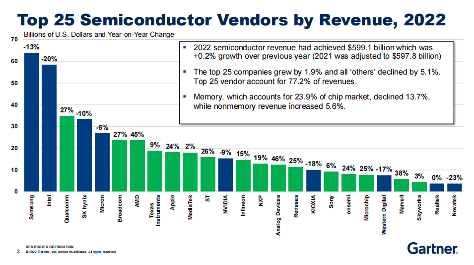 數(shù)據(jù)顯示,2022年全球半導(dǎo)體收入達到5991億美元,僅同比微幅增長0.2%,排名前25半導(dǎo)體廠商總收入同比增長1.9%,“others”總收入則同比下降5.1%。