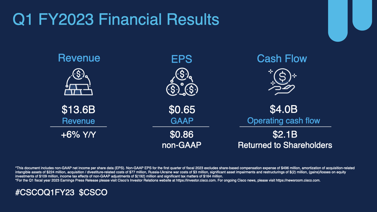 ICC訊(編譯:Vicki)思科公布了截止到2022年10月29日的2023財(cái)年第一季度的財(cái)務(wù)業(yè)績。