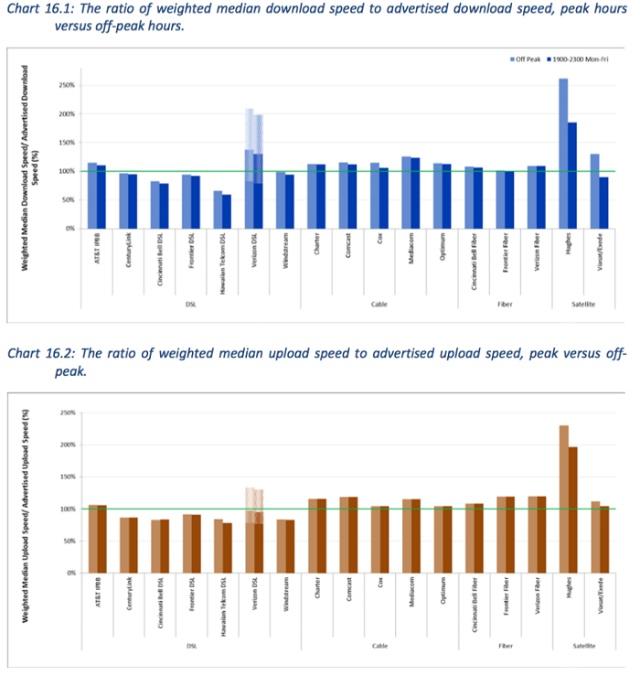 盡管有線與光纖網(wǎng)速的中位數(shù),達(dá)到了廣告宣傳的 100%;但是由 AT&T、Verizon、CenturyLink、Frontier、Windstream 等運(yùn)營商提供的 DSL 網(wǎng)絡(luò)(以及衛(wèi)星接入服務(wù) ViaSat),卻遠(yuǎn)遠(yuǎn)地拖了后腿。