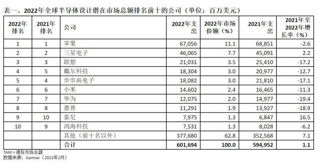 2022年排名前十的公司與2021年完全相同,蘋果和三星電子繼續(xù)排在前兩位。只有三星電子和索尼在2022年增加了芯片支出(見表一)。