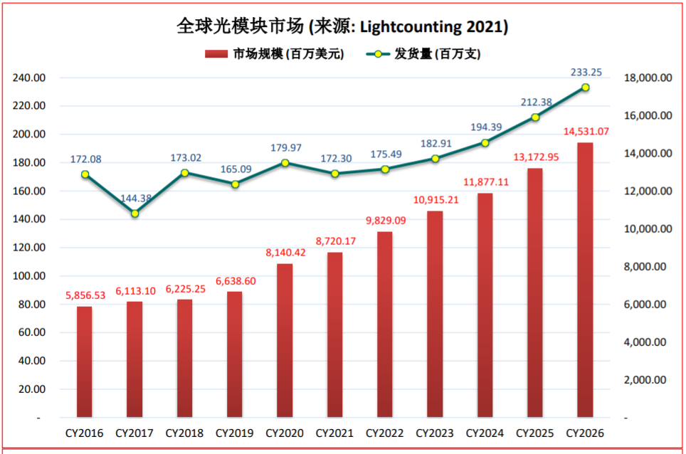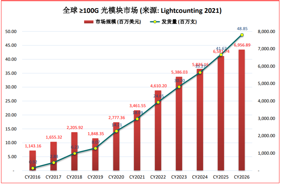 根據(jù)市場咨詢公司Lightcounting預(yù)測, 5G 前傳光模塊的出貨量預(yù)計將從2020年的3,200萬支下降到2021年的2,725萬支;;100G及以上速率的光模塊出貨量從2020年的1,421萬支迅速增加到2021年1,869萬支、2022年2,465萬支及2026年5,000萬支。預(yù)計全球光模塊綜合市場采購額將從2020年的81.4億美元增加到2021年的87.2億美元、2022年98.3億美元及2026年145.3億美元。