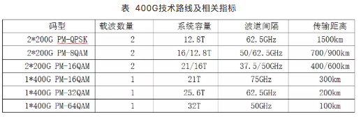 基于2×200G超級通路技術(shù)方案的雙載波400G系統(tǒng)采用PM-QPSK、PM-8QAM或PM-16QAM編碼方式。2014年中國移動(dòng)完成了國內(nèi)首個(gè)雙載波400G(2×200G)現(xiàn)網(wǎng)試點(diǎn)測試,驗(yàn)證其傳輸性能。經(jīng)過近年來光模塊、芯片等核心器件及算法的發(fā)展,國內(nèi)主流傳輸廠商均已支持雙載波400G方案,并且產(chǎn)品逐漸成熟、性能大幅提升。中國移動(dòng)以標(biāo)準(zhǔn)引領(lǐng)為抓手,加速新技術(shù)成熟落地,于2017年率先在國內(nèi)實(shí)現(xiàn)了雙載波400G商用,適用于城域傳輸場景。