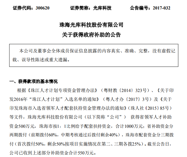 根據(jù)《珠江人才計劃專項資金管理辦法》、《關(guān)于印發(fā)2016年“珠江人才計劃”入選名單的通知》和《關(guān)于印發(fā)珠海市入選省領(lǐng)軍人才配套扶持資金管理辦法的通知》等文件,光庫科技獲得省領(lǐng)軍人才補助資金500萬元,珠海市按1:1比例給予配套扶持資金,合計1000萬元。截至公告日,光庫科技已經(jīng)收到上述部分補助資金合計550萬元。