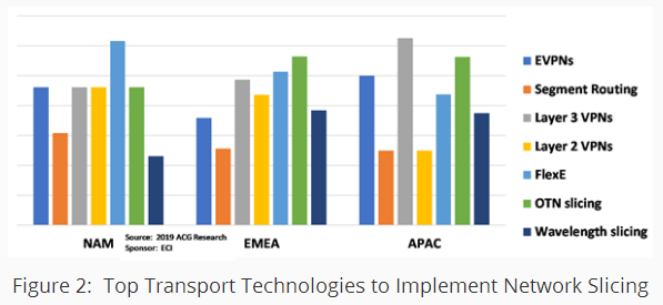 FlexE是服務(wù)提供商打算測試和利用以實(shí)現(xiàn)傳輸網(wǎng)絡(luò)切片的頂級技術(shù)之一。FlexE是所有地區(qū)的頂級技術(shù) - 在北美排名第一,在EMEA排名第二。OIF今年再次在OFC進(jìn)行FlexE演示。雖然FlexE在商業(yè)可用性或部署方面仍處于早期階段,但其通過信道綁定和子速率復(fù)用將IP/以太網(wǎng)移動流量映射到底層光傳輸?shù)哪芰?,為服?wù)提供商提供了靈活的選擇,使其在分離和分割I(lǐng)P/以太網(wǎng)流量同時也最大限度地利用底層光傳輸。