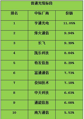 光纖部分:預(yù)估采購(gòu)G.652D光纖9452.21萬(wàn)芯公里,共10家廠商中標(biāo),亨通光電以15.63%的份額位居第一,烽火通信和長(zhǎng)飛緊隨其后。各家廠商具體份額如下: