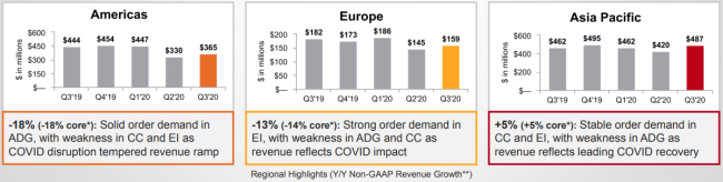 GAAP銷售收入10.11億美元,去年同期10.87億美元?;诤诵幕A(chǔ)的非GAAP銷售收入下滑了7%,其中不包括匯率變化影響以及與過(guò)去12個(gè)月內(nèi)收購(gòu)或出售的業(yè)務(wù)相關(guān)的收入。