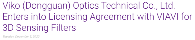 ICC訊(編譯:Nina)美國(guó)加州時(shí)間,2020年12月8日--VIAVI Solutions公司(納斯達(dá)克:VIAV)今天宣布,東莞微科光電科技有限公司(Viko (Dongguan) Optics Technical Co., Ltd.)已同意就使用VIAVI受專利保護(hù)的低角度位移(LAS)濾光片達(dá)成許可協(xié)議。該濾光片用于3D傳感技術(shù)領(lǐng)域。微科光電主要生產(chǎn)紅外截止濾光片組立件(IR Cut Filer)、光學(xué)低通濾波器(OLPF)及各種窄帶膜、高反膜、分光膜等光學(xué)窗口片。