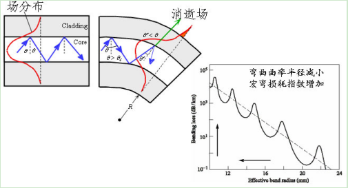 光纖波導由纖芯和包層組成,纖芯折射率高于包層,其導光原理為全內(nèi)反射,即光線由纖芯射向包層時,當入射角大于界面的臨界角,光線完全反射回纖芯。而當光纖彎曲(這里指彎曲半徑遠大于光纖直徑,即宏彎)時,有一部分光線在界面的入射角發(fā)生變化,小于臨界角,這部分光將穿透界面形成消逝場,造成損耗(如圖1所示)。此外,彎曲所導致的折射率變化也會影響光纖的損耗。