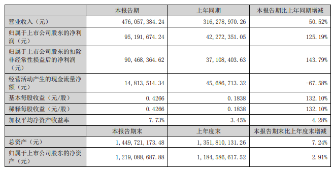 ICC訊 深圳太辰光通信股份有限公司(以下簡(jiǎn)稱(chēng)“太辰光”或“公司”)發(fā)布2022 年半年度報(bào)告稱(chēng):報(bào)告期內(nèi),公司實(shí)現(xiàn)營(yíng)業(yè)收入 4.76億元,同比增長(zhǎng) 50.52%;實(shí)現(xiàn)歸屬于上市公司股東的凈利潤(rùn) 9519.17 萬(wàn)元,同比增長(zhǎng) 125.19%。