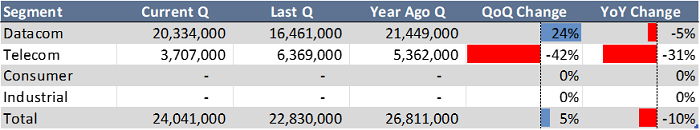 AI統(tǒng)計(jì)的光器件數(shù)據(jù)(不包括用于MSO的功率放大器)同比下降了10%。較小的電信板塊(占光器件收入的15%)同比下降超過(guò)30%。