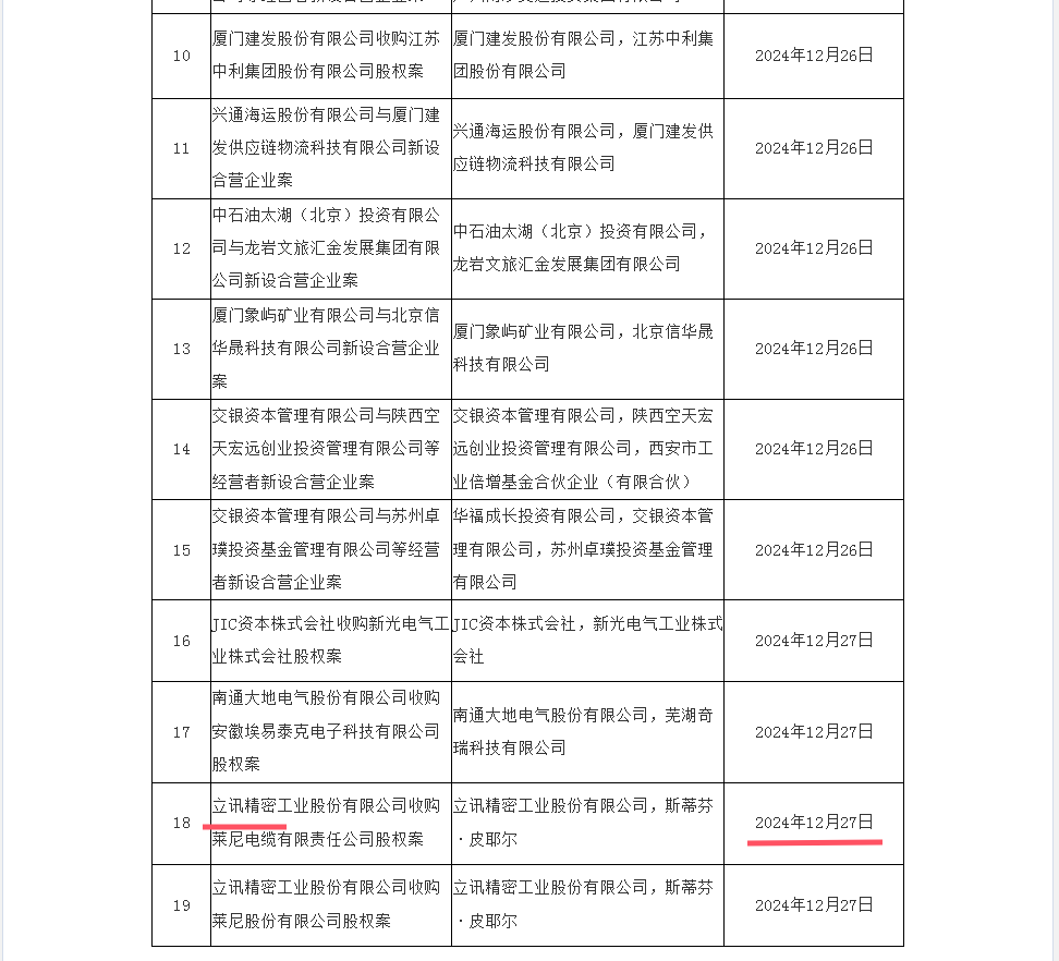 ICC訊 1月6日,國家市場監(jiān)督管理總局披露《2024年12月23日—12月29日無條件批準(zhǔn)經(jīng)營者集中案件列表》,其中就包括了立訊精密工業(yè)股份有限公司收購萊尼電纜有限責(zé)任公司股權(quán)案、立訊精密工業(yè)股份有限公司收購萊尼股份有限公司股權(quán)案。