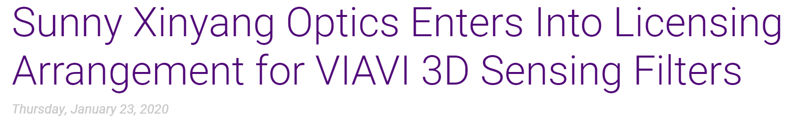 ICCSZ訊(編譯:Aiur) 美國(guó)時(shí)間1月23日,Viavi公司宣布同意授予中國(guó)光學(xué)器件制造商舜宇光學(xué)(Sunny Optical)許可協(xié)議,允許其子公司使用Viavi受專(zhuān)利保護(hù)的低角度移位(LAS)濾光片,主要應(yīng)用在3D傳感(3D Sensing)技術(shù)領(lǐng)域。