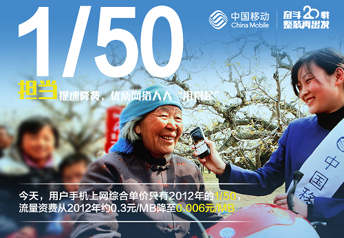 網(wǎng)絡(luò)規(guī)模優(yōu)勢(shì),讓成本下降有空間;精細(xì)化運(yùn)維管理,讓提速降費(fèi)更及時(shí)。2012年以來,中國(guó)移動(dòng)持續(xù)加大投資力度,建成了全球最大4G精品網(wǎng)絡(luò),移動(dòng)網(wǎng)絡(luò)峰值速率從400Kbps提升至110Mbps; 打造高品質(zhì)全光網(wǎng)絡(luò),接入帶寬從2Mbps左右提升到全網(wǎng)100Mbps以上,重點(diǎn)區(qū)域達(dá)到1000Mbps。同時(shí),中國(guó)移動(dòng)進(jìn)一步取消手機(jī)長(zhǎng)途、漫游通話費(fèi)和流量漫游費(fèi)。今天,用戶手機(jī)上網(wǎng)綜合單價(jià)只有2012年的五十分之一,流量資費(fèi)從2012年約0.3元/MB降至0.006元/MB,流量消費(fèi)全面進(jìn)入“G級(jí)”時(shí)代。此外,企業(yè)互聯(lián)網(wǎng)專線、家庭寬帶、國(guó)際通信資費(fèi)大幅下調(diào),累計(jì)惠及超10億客戶和400萬家企業(yè)。
