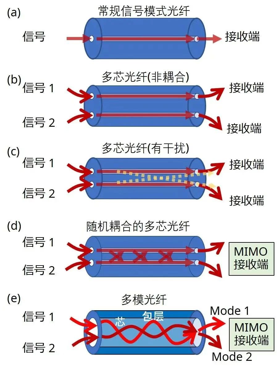 當(dāng)一個光信號在光纖的芯部傳播時,它以各種振動狀態(tài)傳播,同時在芯部和包層的邊界處重復(fù)全反射(圖1e)。這些不同的振動狀態(tài)就是傳播模式。多模光纖有一個大的纖芯直徑,在一個纖芯內(nèi)存在多種模式。在多模光纖的傳播、輸入/輸出和接續(xù)過程中會出現(xiàn)不同模式之間的信號干擾,這就需要使用MIMO數(shù)字信號處理*?來消除干擾。由于到達(dá)接收器之前的時間差,不同模式的信號需要優(yōu)化光纖和重載的數(shù)字信號處理。到目前為止,多模光纖傳輸最多可使用55種模式。