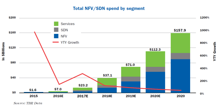 投資的過(guò)程是艱難而且巨大的,一份來(lái)自IHS的報(bào)告預(yù)測(cè)了服務(wù)提供商NFV的市場(chǎng),其中包括硬件、軟件以及服務(wù)等部分。報(bào)告中顯示,NFV的市場(chǎng)將從2015年的27億美元迅速攀升至2020年的155億美元,預(yù)測(cè)指出,NFV的軟件市場(chǎng)將占有155億美元中的80%,也就是說(shuō),在NFV市場(chǎng)的投入,每5美金就會(huì)有4美金花費(fèi)在軟件上。