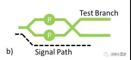 這種方案比較直接,可用于在功能單元較少的時候。一旦器件數(shù)目較多,需測試的結(jié)構(gòu)相應(yīng)增加,輔助測試的結(jié)構(gòu)就會占據(jù)較大的面積。而流片面積直接與成本掛鉤。另一方面,假設(shè)一個測試結(jié)構(gòu)分光比是5%, 10個測試結(jié)構(gòu)的分光損耗就會達到2.2dB,會影響整個系統(tǒng)的link budget。