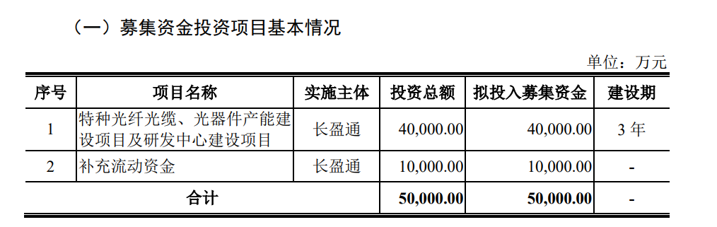 公司本次擬公開發(fā)行不超過2353.3544萬股人民幣普通股(A股),募集資金扣除發(fā)行費(fèi)用后將全部用于與公司主營業(yè)務(wù)特種光纖光纜、光器件產(chǎn)能建設(shè)項(xiàng)目及研發(fā)中心建設(shè)項(xiàng)目和補(bǔ)充流動(dòng)資金。