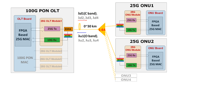 IEEE 802.3系列于2004年和2009年發(fā)布了EPON及10G-EPON標(biāo)準(zhǔn)。2015年底,IEEE802.3ca (100G EPON標(biāo)準(zhǔn))也已正式立項(xiàng),發(fā)布了25G、50G及100G的目標(biāo)速率等級(jí)。在100G EPON系統(tǒng)中,作為家庭接入用戶(hù),單波25G PON可以作為主流技術(shù);對(duì)于政企用戶(hù),由于帶寬需求更大,可以在單波長(zhǎng)25G基礎(chǔ)上,通過(guò)波長(zhǎng)疊加,實(shí)現(xiàn)2×25G或4×25G更高帶寬。